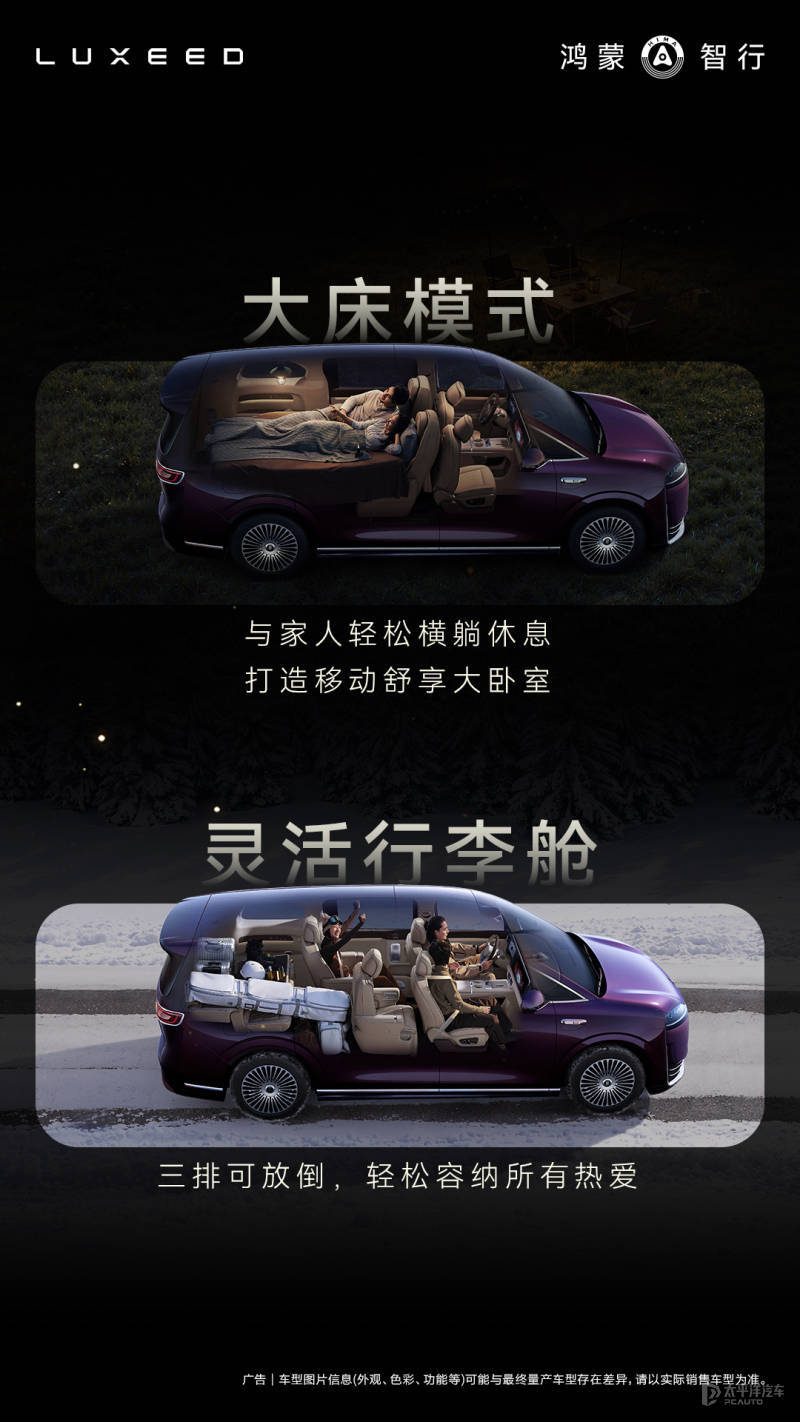 作为回顾,外观方面,智界V9整体风格更简约大气,与市面主流采用大嘴前脸和繁复格栅的MPV大相径庭,前脸采用贯穿式的灯带设计,两侧大灯组造型与问界M9非常相似,且加入尊界S800同款的像素大灯,以及首发全新一代DLP投影大灯和动态迎宾光毯组合,并且可自定义迎宾灯语。