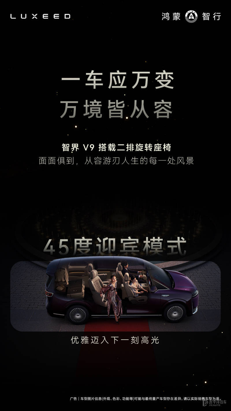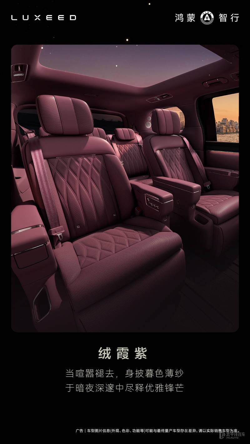 内饰方面,智界V9将会采用全新的三联屏设计,风格与尊界S800相似,配备了绒霞紫内饰配色,且用料极为考究,包括采用NAPPA头层真皮座椅、天然实木饰板、晶钻切工水晶的旋钮等高端材质。