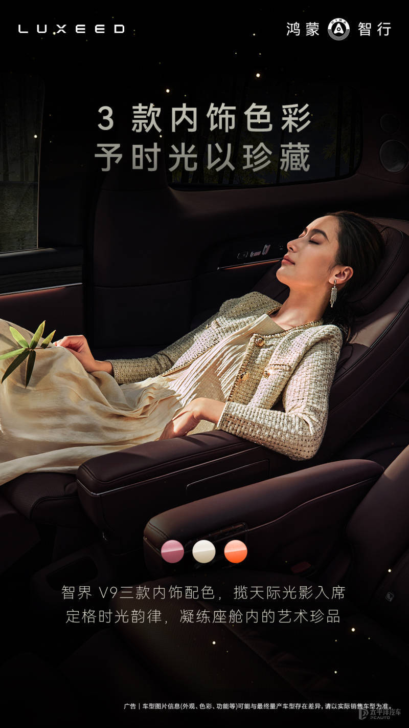 【太平洋汽车 新车频道】3月31日,智界V9官宣三款内饰配色:绒霞紫、韶华杏、赤茶橘,灵感来源于破晓微光、正午阳光和傍晚暮色的一日三时光影,满足不同用户的审美需求。