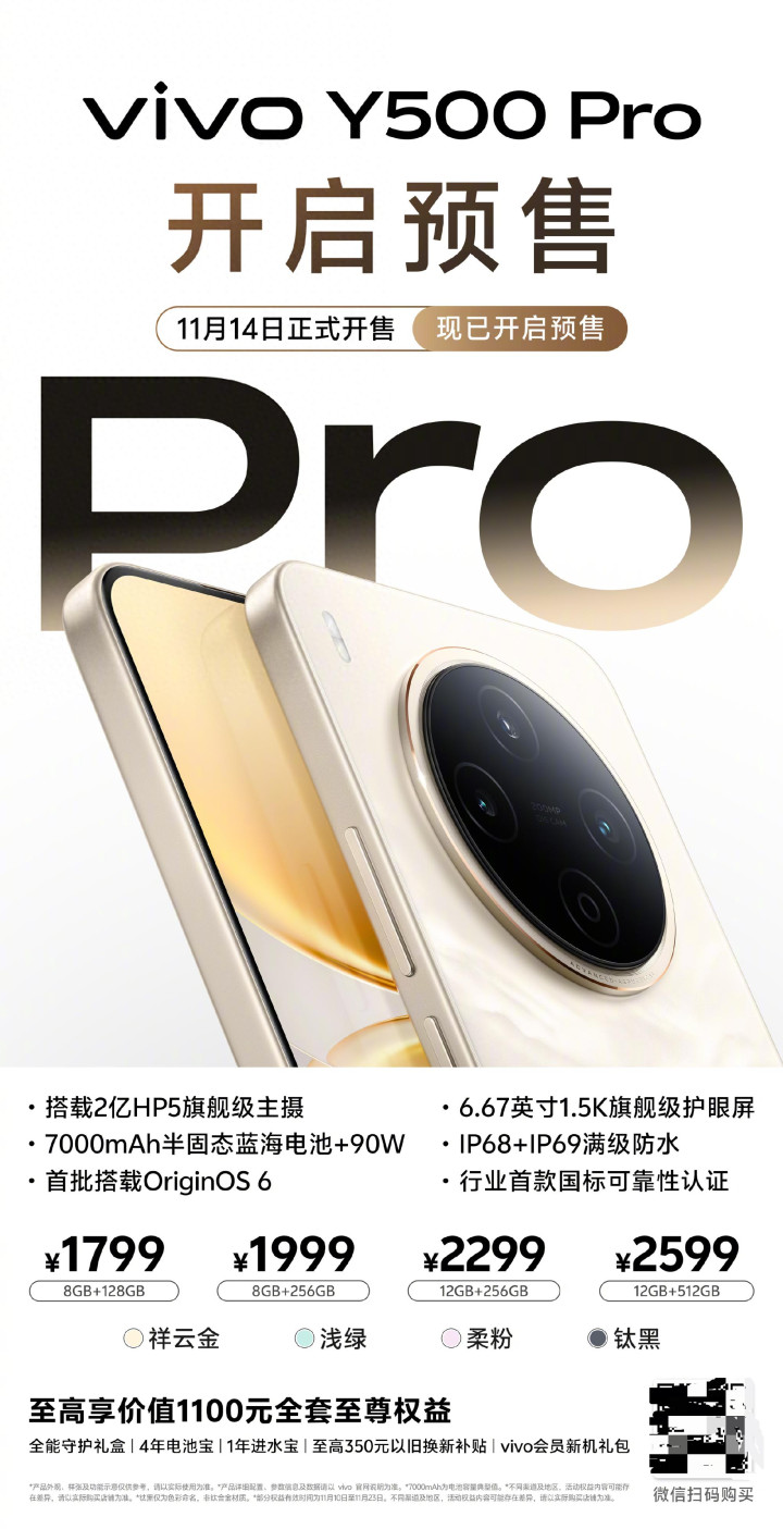 现在预售福利超给力,购机至高享1100元好礼,4年电池宝、1年进水宝直接把售后安全感拉满,还有350元以旧换新补贴和6期分期免息。不管是毛手毛脚的学生党,还是经常户外工作的打工人,这台硬核耐造的vivo Y500 Pro都值得冲,现在下单,把这份安心提前锁定!
