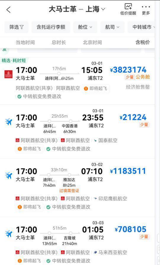 2月28日,据携程APP,当地时间17时从大马士革飞往上海浦东机场的航班,票价飙升至382万元。